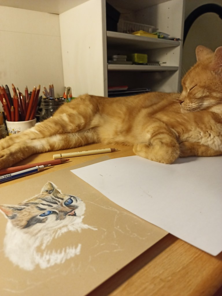 Un altro aspetto che mi ha sorpreso è stato come la carta per pastello, pur mantenendo la sua texture visibile, ha consentito di sovrapporre strati di colore senza compromettere l’intensità della tonalità, ma piuttosto arricchendola. Questo mi ha dato maggiore libertà nell’esplorazione delle ombre e dei riflessi, riuscendo a rendere più verosimili alcune parti del gatto.