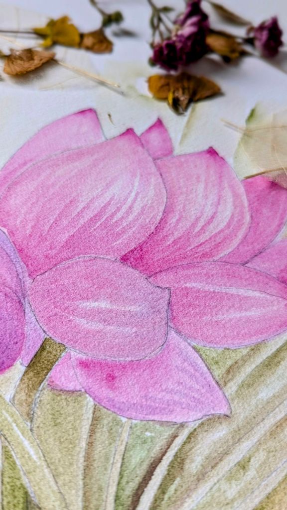 La carta per pastello ha una texture che, all’inizio, sembrava un po’ più difficile da gestire rispetto alla tradizionale carta per acquerello, che solitamente permette una bagnatura più uniforme. La superficie alveolata , però, ha conferito un effetto interessante. Questo ha dato vita a una serie di sfumature quasi impreviste, che ho deciso di sfruttare per aggiungere un tocco di spontaneità al mio lavoro.